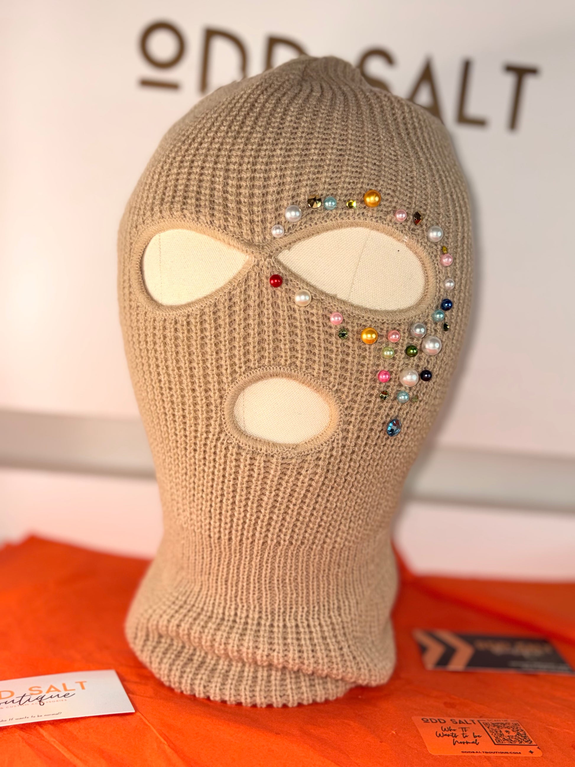 Hand-embellished with multicolor crystals and pearls, this couture balaclava is designed for those who don’t blend in — they stand apart. Each piece is individually detailed, making no two masks exactly alike.